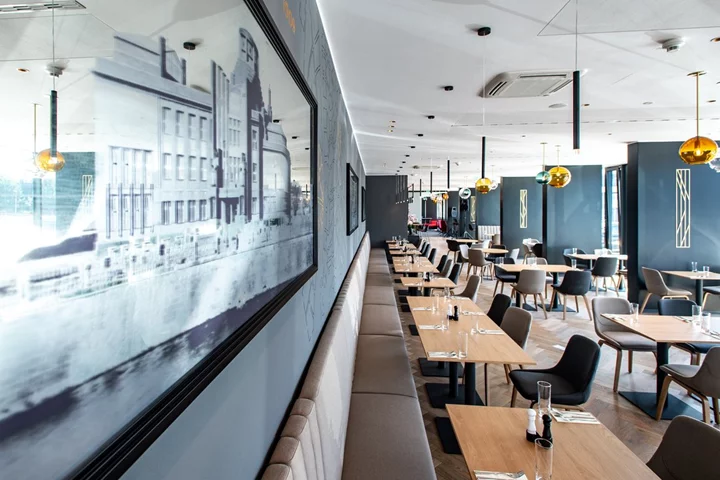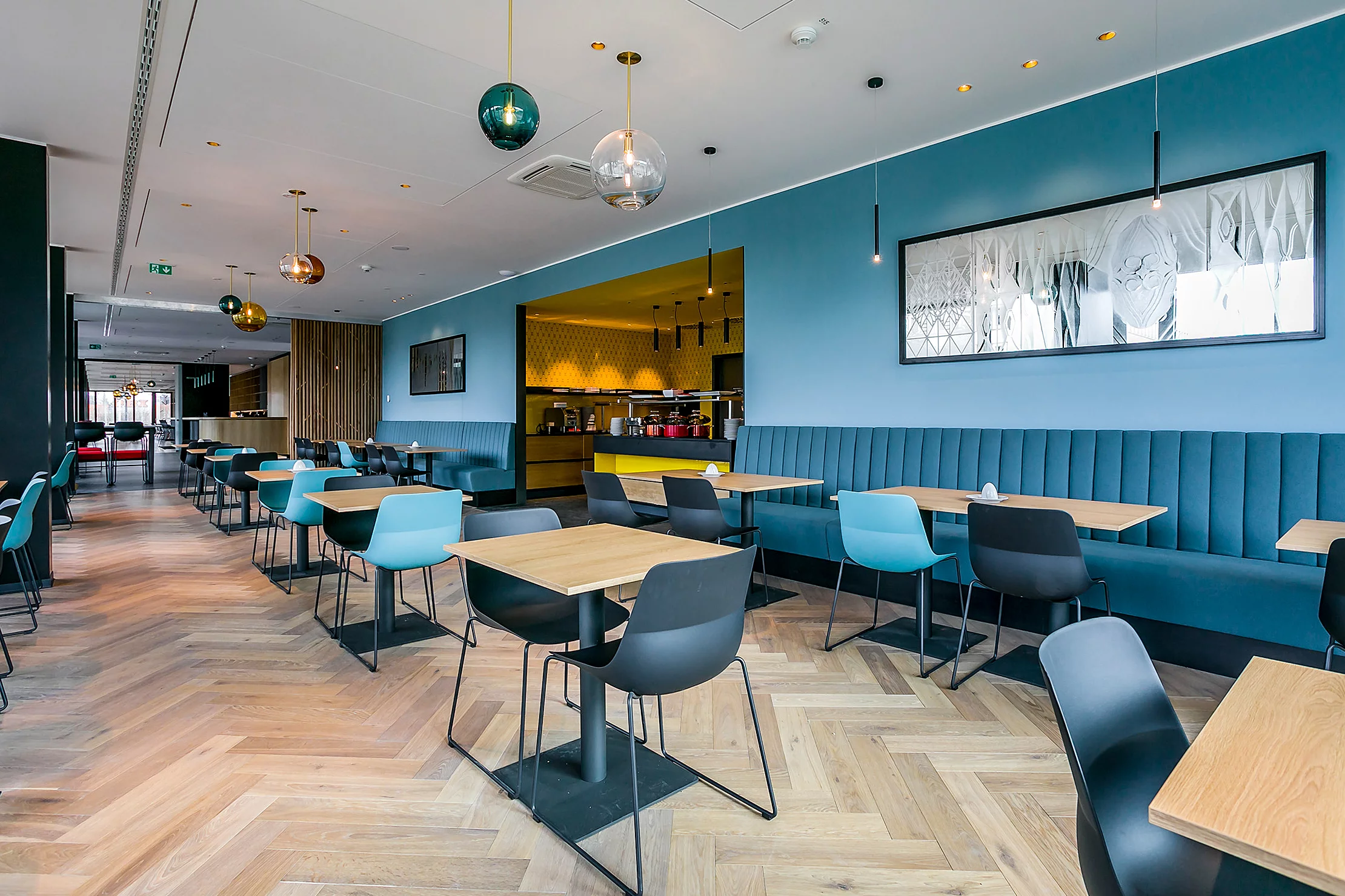 Interiérové prvky v luxusní restauraci a oddělené snídaňové části.