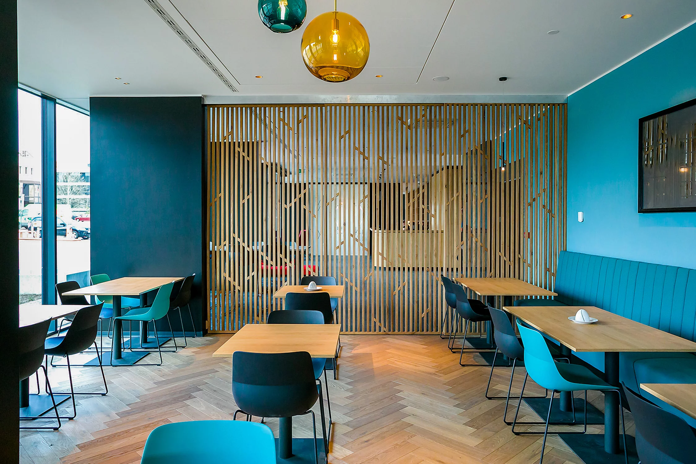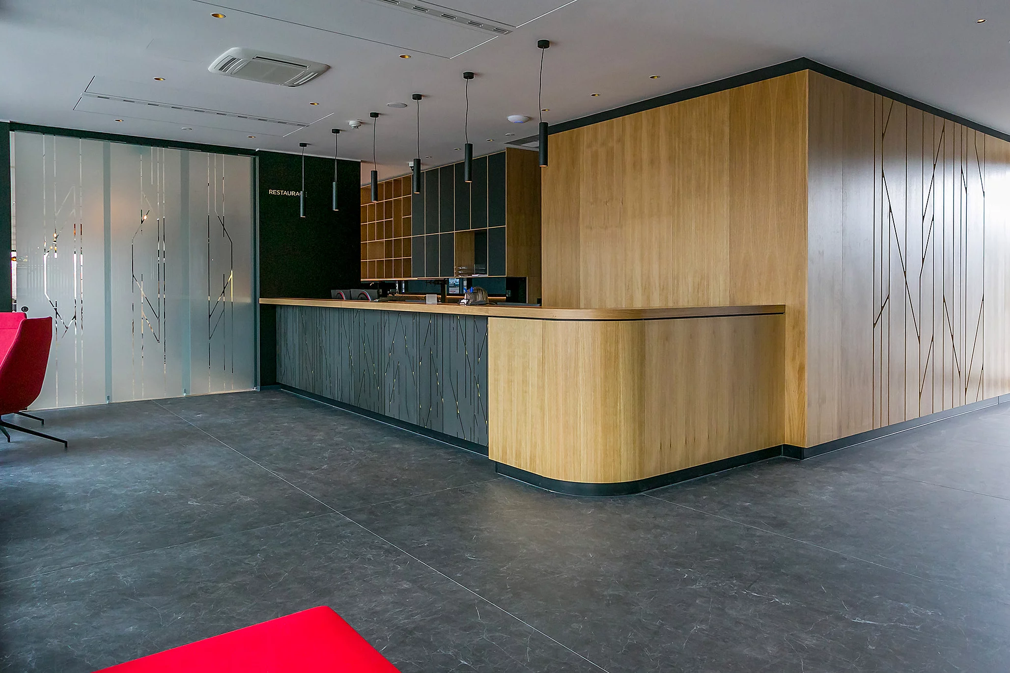 Interiérové prvky v luxusní restauraci a oddělené snídaňové části.