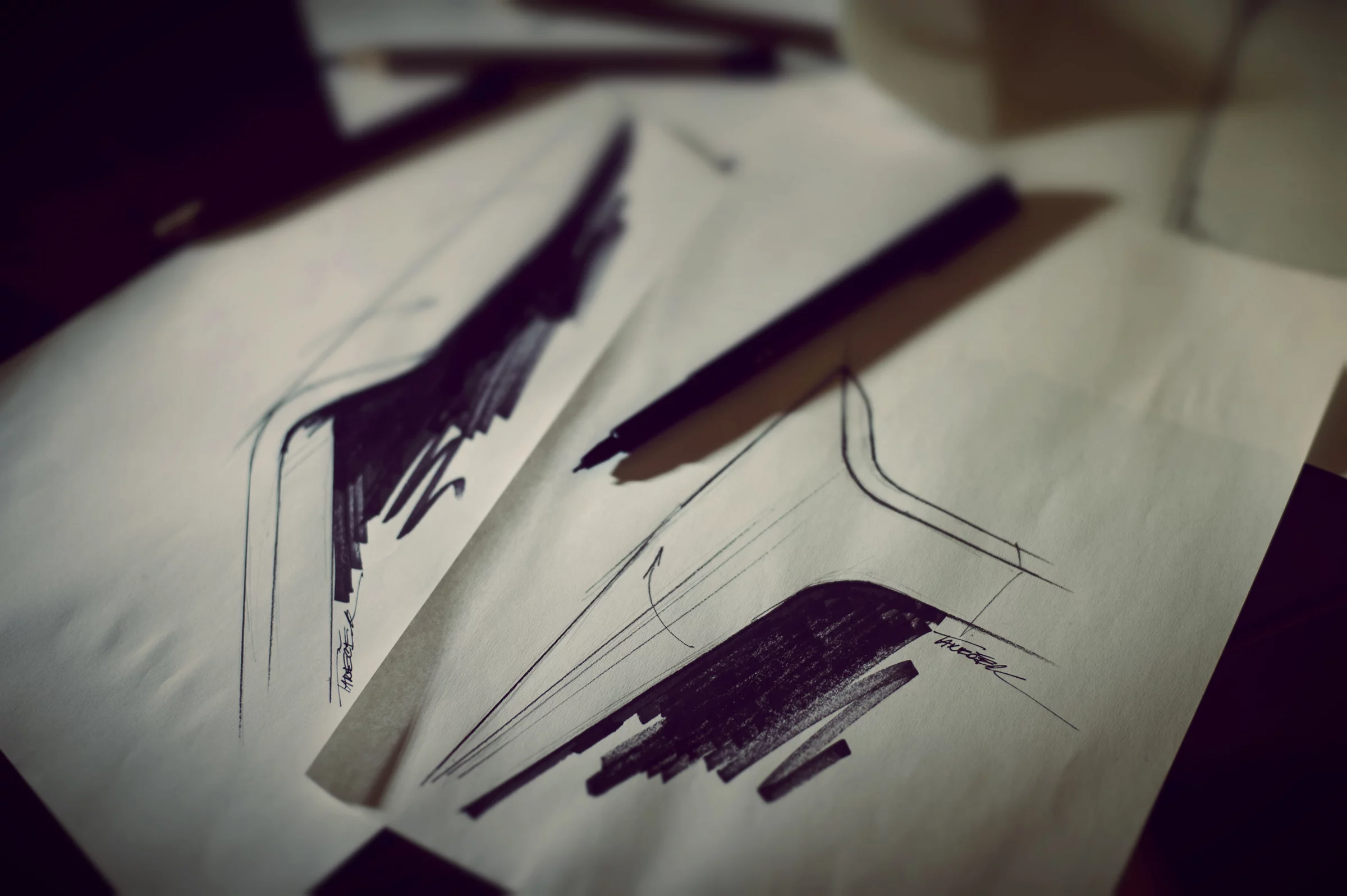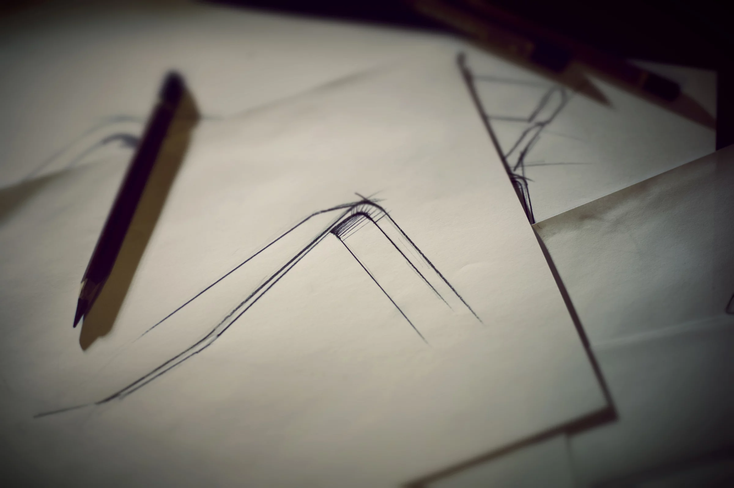 Ze série skic a náčrtů vznikl návrh křesla a sedačky elegantních tvarů s